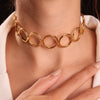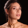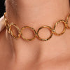 The Zenith choker sits gracefully at the neckline, with radiant golden circles linked together in perfect symmetry.